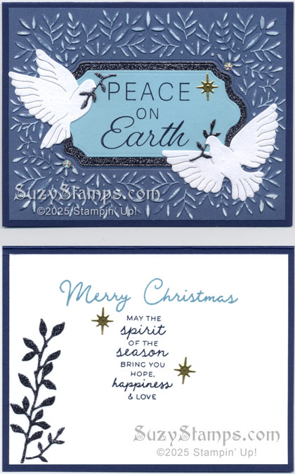 This card from the November Stampin’ Class uses the Peace on Earth Stamp Set & Dies, Jolly Holly Stamp Set, Peaceful Greenery 3D Embossing Folder, Night of Navy Two-Tone Cardstock, All Season Velvet Specialty Paper, Peaceful Garden Glimmer Paper, Gold Foil and Iridescent Faceted Gems. Register today for this fun class! Paid registration must be received by November 1.