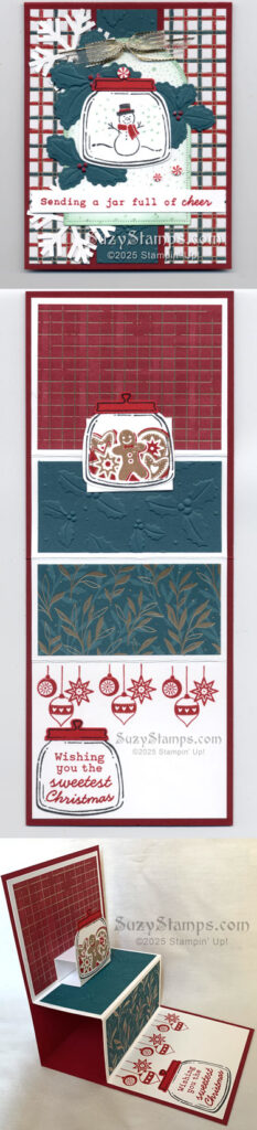This card from the November Stampin’ Class uses the Jar of Joy Stamp Set, Falling Snow Stamp Set, Sweet Jar Builder Punch, Happy Labels Pick A Punch, Everyday Arches Dies, Jolly Holly Hybrid Embossing Folder & Dies, Regal Distressed Patterns 12”x12” Specialty Paper, Gold Striped Mesh Ribbon, Real Red & White Adhesive-Backed Peppermints, Stampin’ Write Markers and Blending Brushes. I used an old retired punch for the snowflakes, but you can find some nice snowflake dies in the Snowflake Kisses Die Set. Have you registered yet? Paid registration must be received by November 1.
