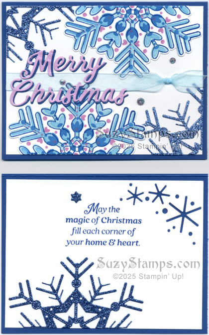 We will make this card at the November Stampin’ Class using the Snowy Delights Stamp Set, Masks & Dies, Words For The Season Stamp Set & Dies, Peaceful Garden Glimmer Paper, Balmy Blue Sheer Ribbon, Two-Tone Sparkle Gems, Blending Brushes and Sizzix Stencil and Stamp Tool. Don’t miss out on the fun – register today!