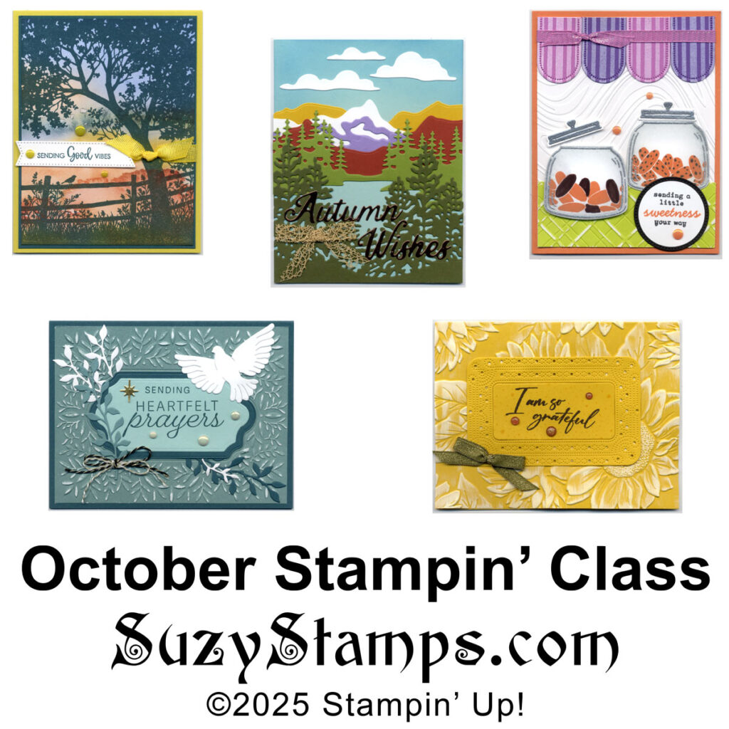 We will make this Halloween card at the October Stampin’ Class using the Sweet Jar Stamp Set & Sweet Jar Builder Punch, Stripes & Dots Stamp Set, Stylish Shapes Dies, Everyday Arches Dies, Words for the Season Dies, 1-1/2” Circle Punch or Die, Forever Plaid 3D Embossing Folder, So Swirly Embossing Folder, Lemon Lime Twist Two-Tone Cardstock, Silver Stampin’ Emboss Powder, Petunia Pop Iridescent Ribbon, 2025-2027 In Color Flat Pearls, Blending Brush, Black Stampin’ Write Marker and Sandpaper. Don’t miss out on the fun – register today!